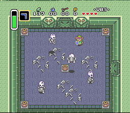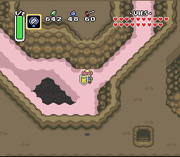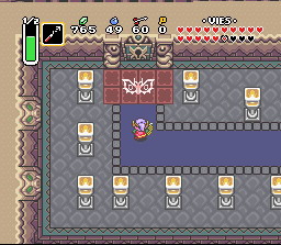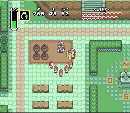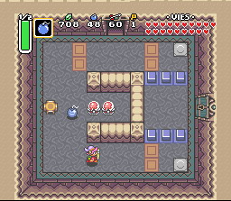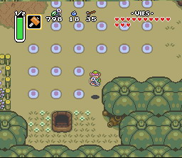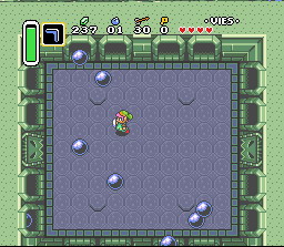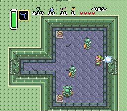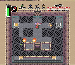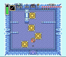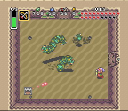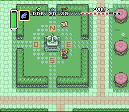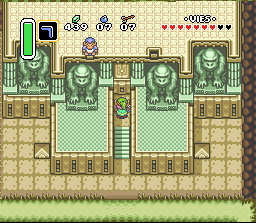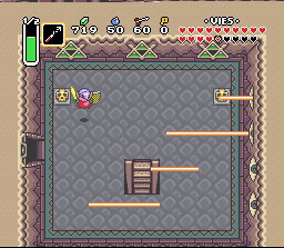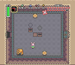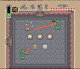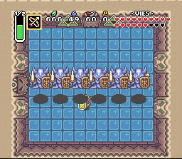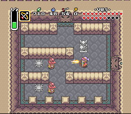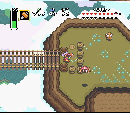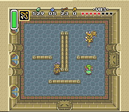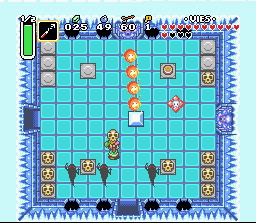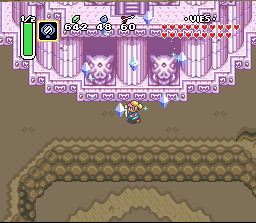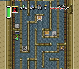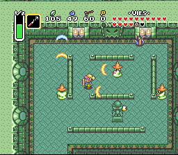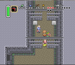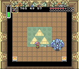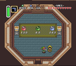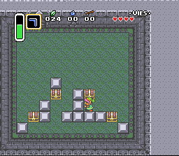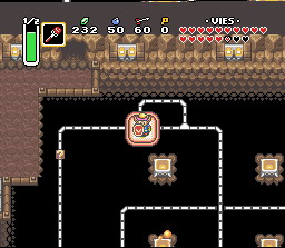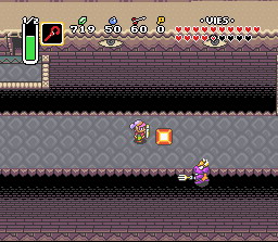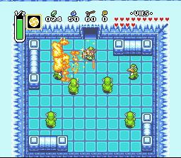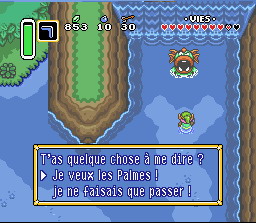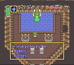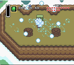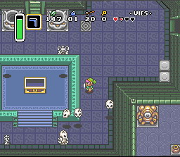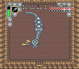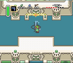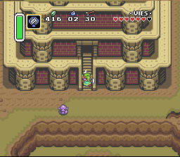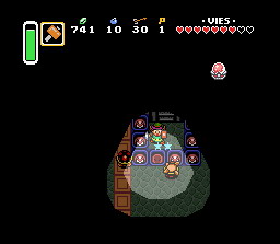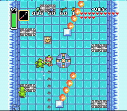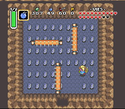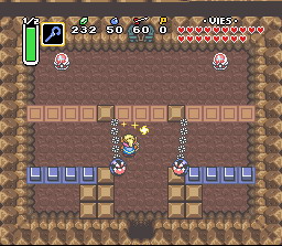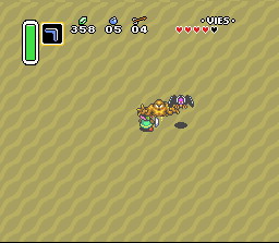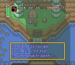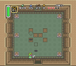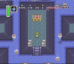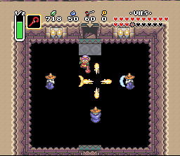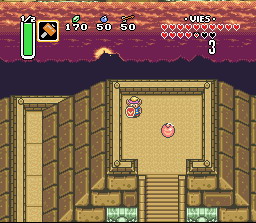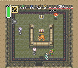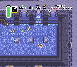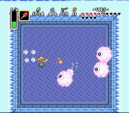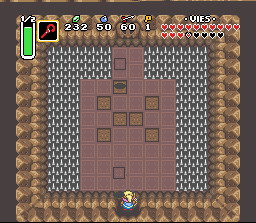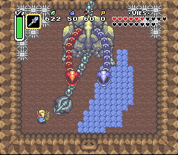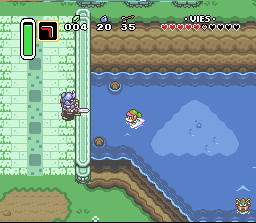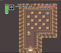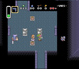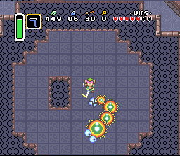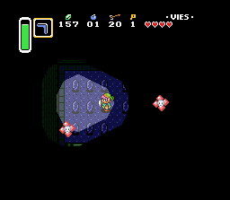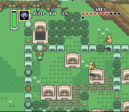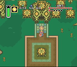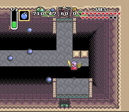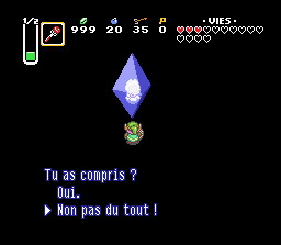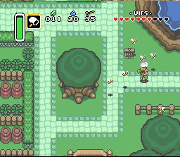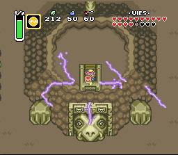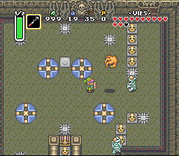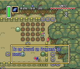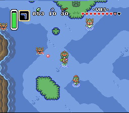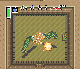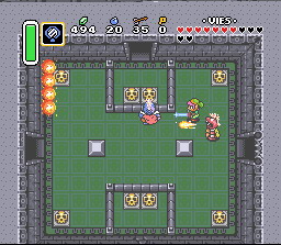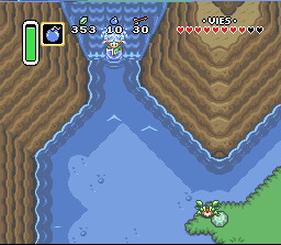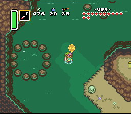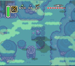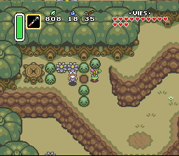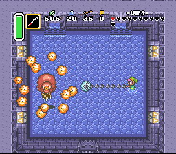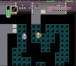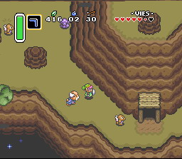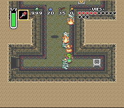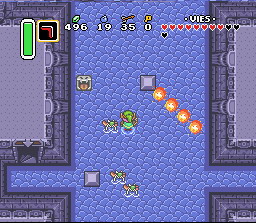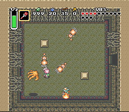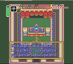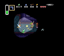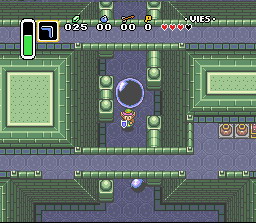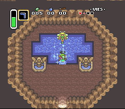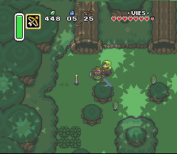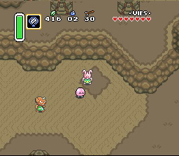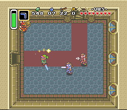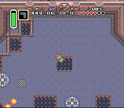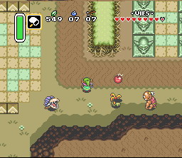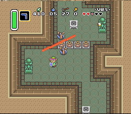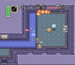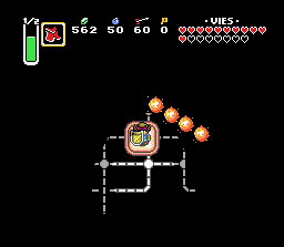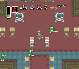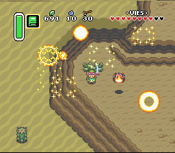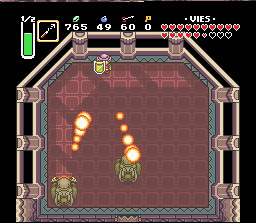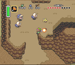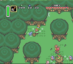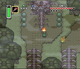 Astuces : - Dans les forteresses vous rencontrerez des crânes volants avec des petites flammes qui tournent autour. Vous vous demandez comment les vaincre, il vous faut mettre un peu de poudre magique sur elles et surprise, elles se transforment en fée. Très utile pour remonter ses coeurs. - Allez dans le monde claire tout au sud-est, puis remontez jusqu'à la grotte glacée. Posez une bombe dans le mur du haut et entrez. Au milieu de la pièce se trouve une statue de fée. Foncez dessus avec les bottes de Pégase. Une abeille clignotante apparaît, capturez la et libérez la devant le vendeur du village de Cocorico. Ce dernier vous en donnera 100 rubis.