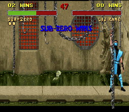 Le seul finish que l'ordi se permet de faire est de vous envoyer dans l'acide. Liu Kang fait une balayette avec un mouvement bien décomposé.