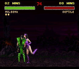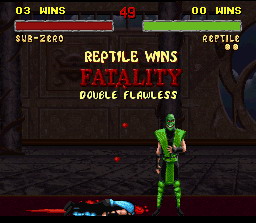 Chaque personnage a plusieurs fatality, ici Reptile montre son véritable visage et avale la tête de son adversaire dépité si je puis dire. On se croirait dans V vue la tête et les habits de Reptile.