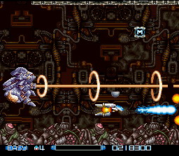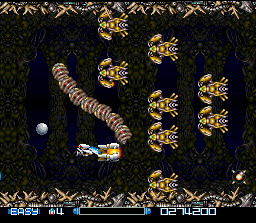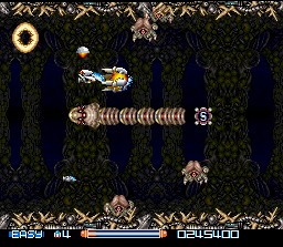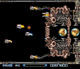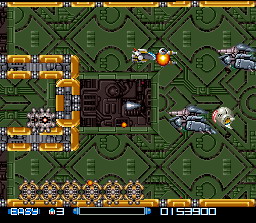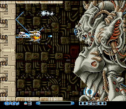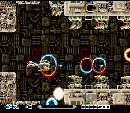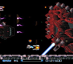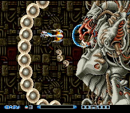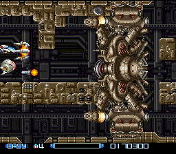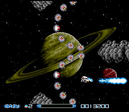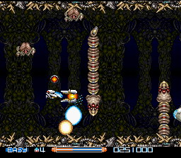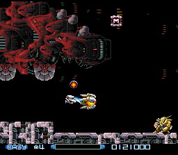 Le remake de la version cpc, nes et master system remastorisée en plus beau est un shoot'em up. Il figure parmi les 5 premiers jeu de la console. Le but est de sauver l'univers de la domination de l'empire Bydo, lequel est dirigé par de grosses larves intelligentes et malveillantes qui colonisent les planètes les unes après les autres. D'autres vaisseaux de combat se sont mesurés à l'hégémonie de cette empire mais sans succès. A vous de vous montrer à la hauteur de l'espoir placé en vous. Et c'est peu dire vue la difficulté du jeu est le petit nombre de vies que les concepteurs du jeu vous ont accordés. L'ambiance du jeu est bien rendue, comme sur cpc, on passe par des lieux différents. Vos ennemies sont parfois des monstres, parfois des robots, parfois des machines dirigés par des êtres... Les différents tires du jeu. Au cours de votre progression dans cette univers intergalactique, vous croiserez des capsules qui une fois détruites offrent des bonus. Ainsi vous pourrez avoir des boucliers plus ou moins perfectionnés que vous pourrez envoyer sur les ennemies et ce faisant dispersé votre tire ou vous protéger avec. D'autres items sont des accélérateurs ce qui rend la maniabilité moins bonne car le vaisseau réagit trop vivement. Et en fin les nouvelles armes : - Le tire normal en rafale ou qui peut se concentrer avec B sans lâcher. Si vous maintenez jusqu'à obtenir la barre rouge qui clignote, vous aurez le tire le plus puissant. - Les lasers qui rebondissent. - Les boules jaunes qui se dispersent légèrement. - Les vagues de feu qui patent vers le haut et le bas puis longent les parois. - Les anneaux d'énergie. - Les 2 missiles à tête chercheuse (en +) - La capsule de bombardement (en +)